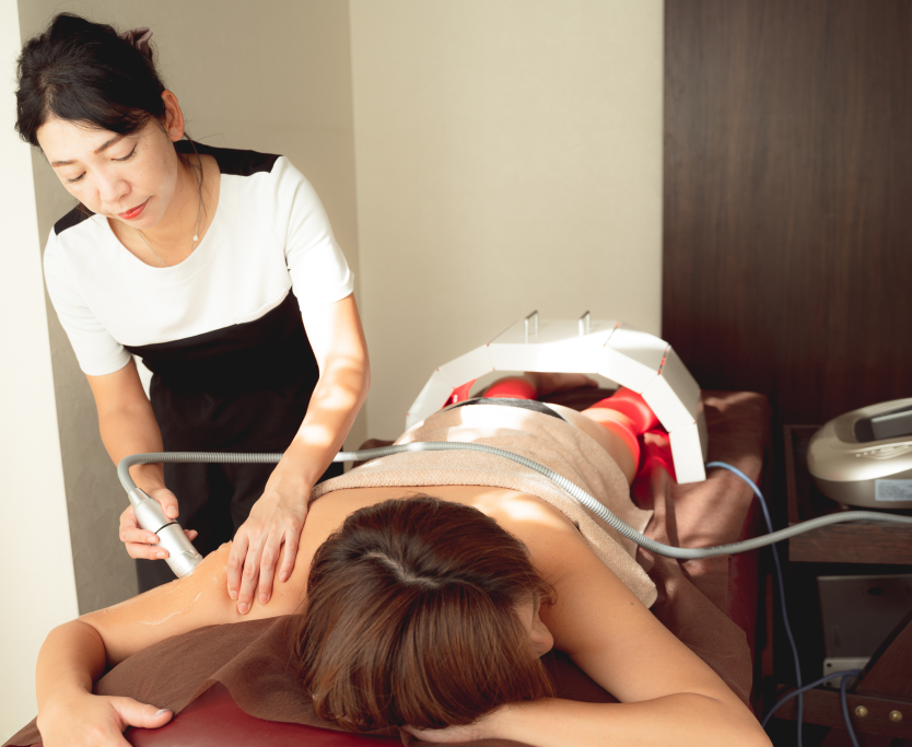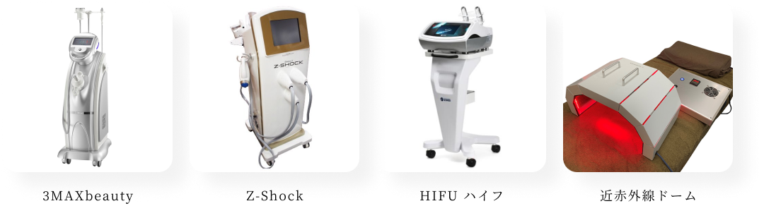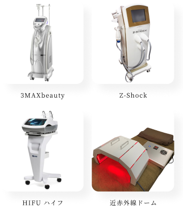 お客様のお悩みや目的・体質に応じて最新マシンを使い分け施術します。全身を温めて、硬く冷たくなった脂肪を燃焼しやすい状態にする最新のラジオ波マシンと近赤外線のドーム。高い痩身効果・たるみの引き締め効果があり、リバウンドしにくいと言われているHIFU。衝撃波による脂肪細胞を減らす作用があるZショックプレッシャーは、取扱い店が少なく湘南エリアで受けられるのは当店のみです。