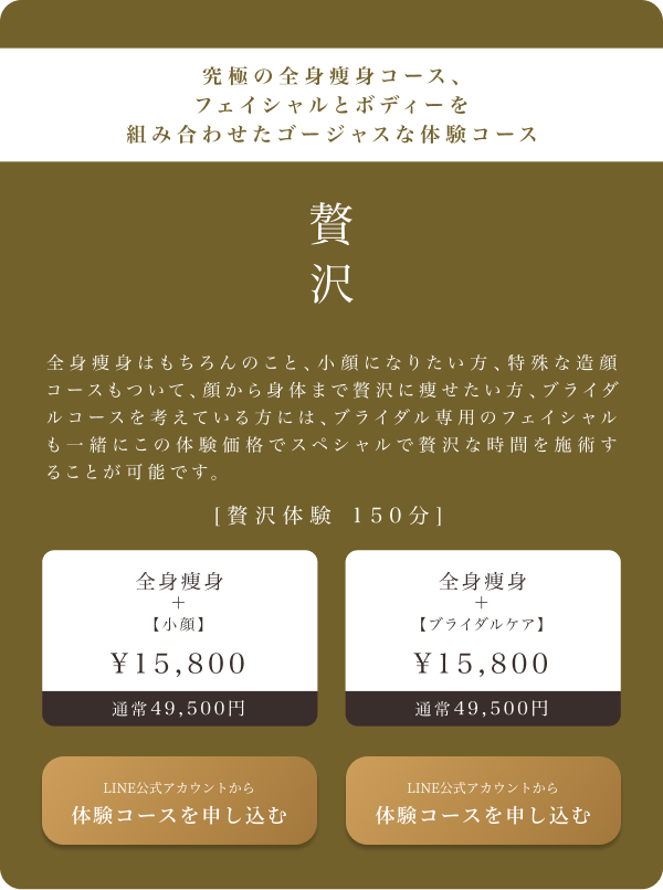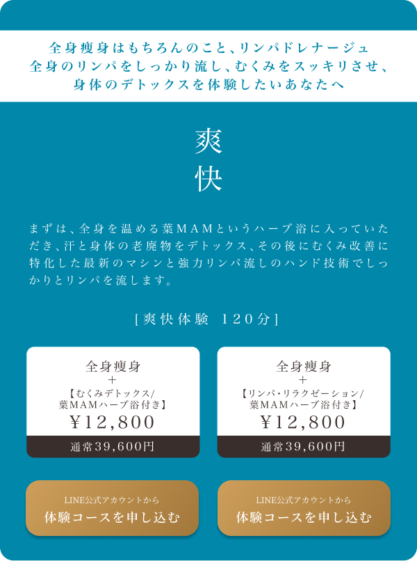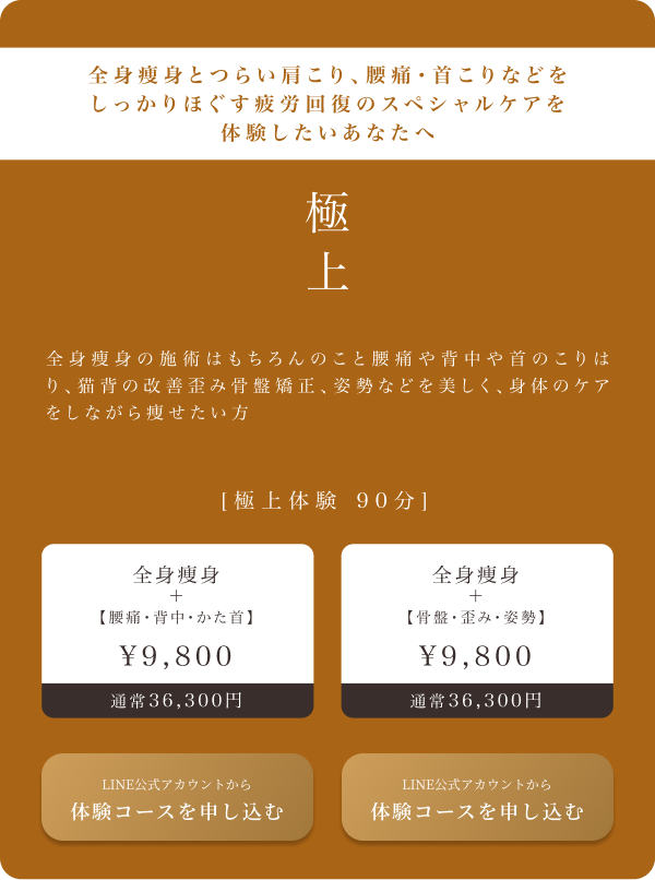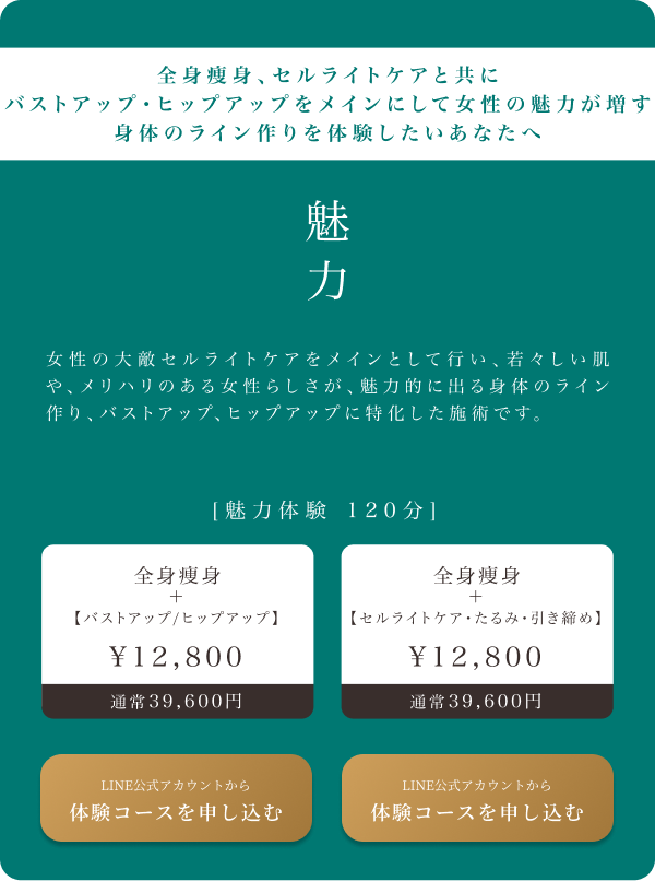 施術してお客様が1番驚くのがこのハンド技術!「ハンドマッサージに感動しました!」と沢山のお言葉を頂いております! このハンド技術がなければ全身痩身は完成しない程の技術力の高さです。ハンド技術はもちろんのこと、身体を知り尽くした知識にも魅了されるお客様が多いです。