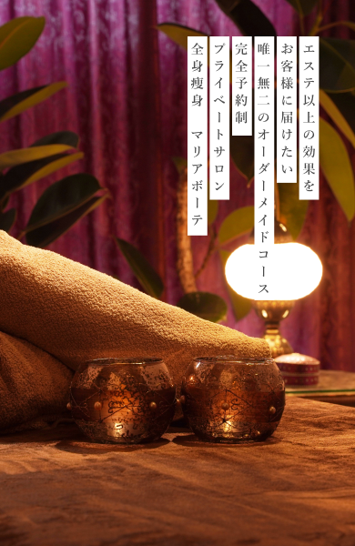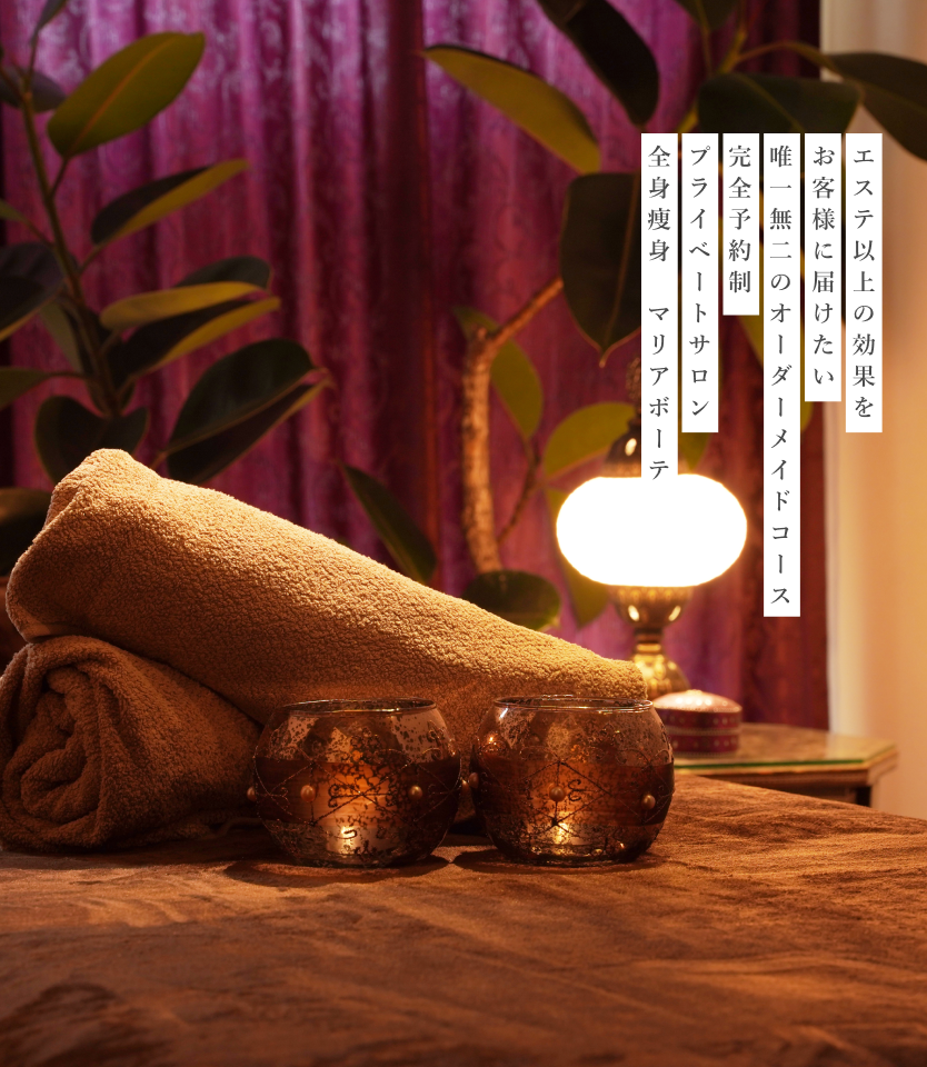 最新マシンと独自のマッサージ法+ストレッチを組み合わせた、唯一無二のこだわりの「オーダーメイドコース」は私がエステティシャンとして、20年以上、お客様一人一人の身体と向き合い、身体の声を汲み取り、経験と知識を元に結果、効果を積み重ねてきました。私の考えるエステの効果とは、痩せてキレイになる以上に、年齢と共に感じる身体の衰え、不調箇所のお悩みを改善して、身体を楽に、健康維持の1つとしての美容法がエステサロンでの施術ケアと実感しております。アラビアンナイトの様な異空間で癒されながら、身体のメンテナンスにぜひお越しくださいませ。